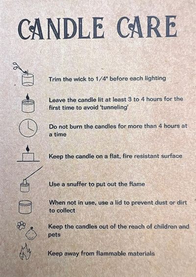 ~Allow wax to melt completely to the edges of the container to prevent tunneling. Diameter of the container dictates how many hours first burn should be (ex: 3" diameter = 3 hours for first burn)